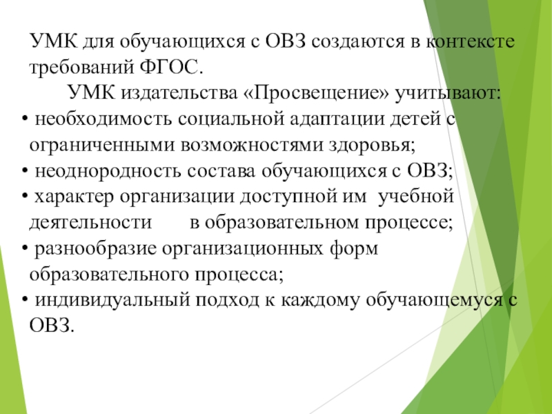 Слайд 14УМК для обучающихся с ОВЗ создаются в контексте требований ФГОС.