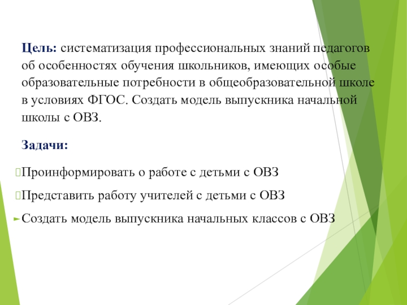 Слайд 2Цель: систематизация профессиональных знаний педагогов об особенностях обучения школьников, имеющих особые образовательные