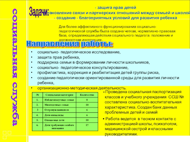 Проведена социальная паспортизация классов и учебного учреждения ССШ № составлена социально-воспитательная характеристика. Создан банк данных проблемных детей и семей