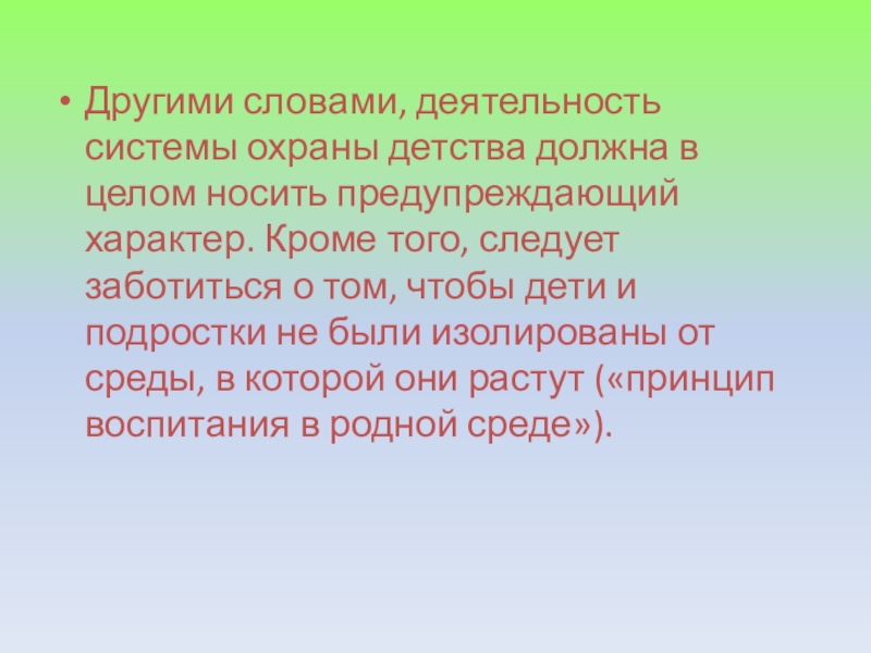Слайд 7Другими словами, деятельность системы охраны детства должна в целом носить предупреждающий
