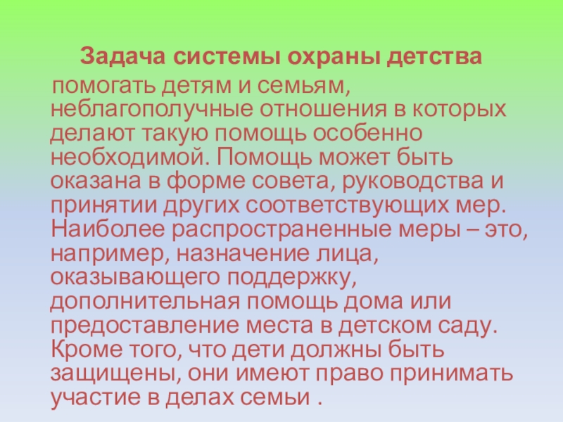 отношения между детьми и родителями. Связь с родителями – это то, что само по себе должно способствовать полноценному развитию детей. Система охраны детства должна, насколько это возможно, способствовать тому, чтобы в семьях существовали наиболее благоприятные условия для заботы о детях.