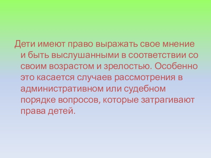 соответствии со своим возрастом и зрелостью. Особенно это касается случаев рассмотрения в административном или судебном порядке вопросов, которые затрагивают права детей.