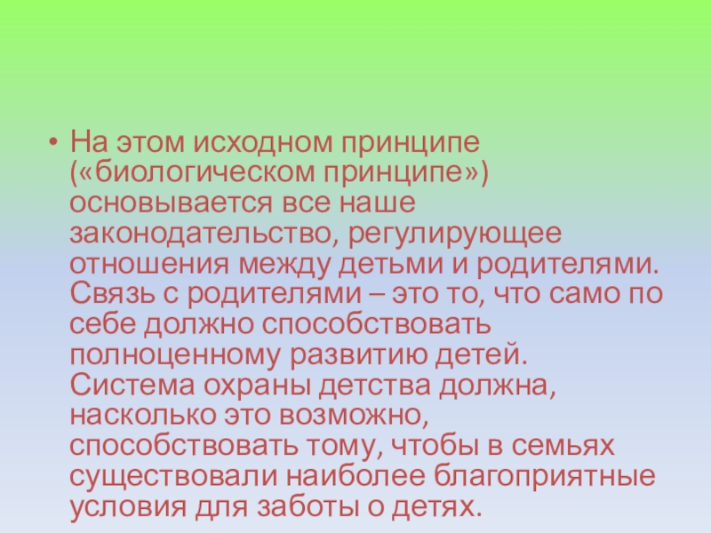 Слайд 6На этом исходном принципе («биологическом принципе») основывается все наше законодательство, регулирующее