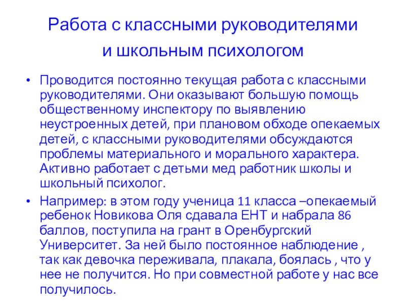Например: в этом году ученица 11 класса –опекаемый ребенок Новикова Оля сдавала ЕНТ и набрала 86 баллов, поступила на грант в Оренбургский Университет. За ней было постоянное наблюдение , так как девочка переживала, плакала, боялась , что у нее не получится. Но при совместной работе у нас все получилось.