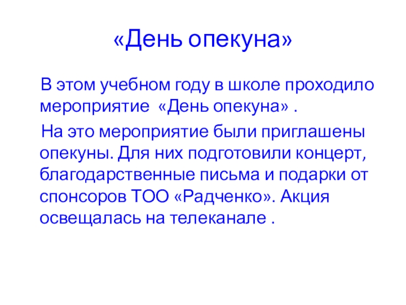 На это мероприятие были приглашены опекуны. Для них подготовили концерт, благодарственные письма и подарки от спонсоров ТОО «Радченко». Акция освещалась на телеканале .