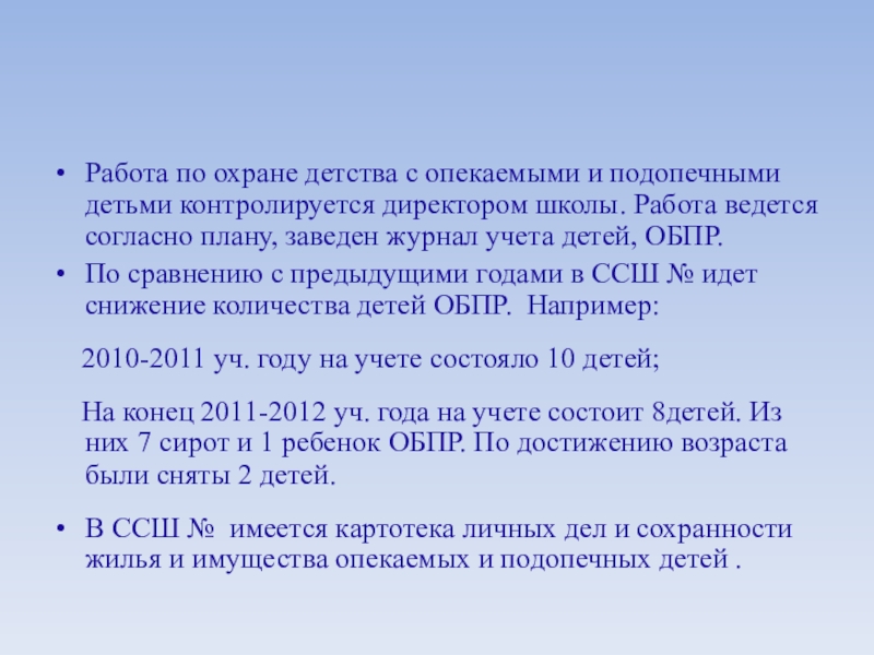 На конец 2011-2012 уч. года на учете состоит 8детей. Из них 7 сирот и 1 ребенок ОБПР. По достижению возраста были сняты 2 детей.