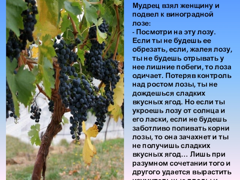 Слайд 4Мудрец взял женщину и подвел к виноградной лозе: