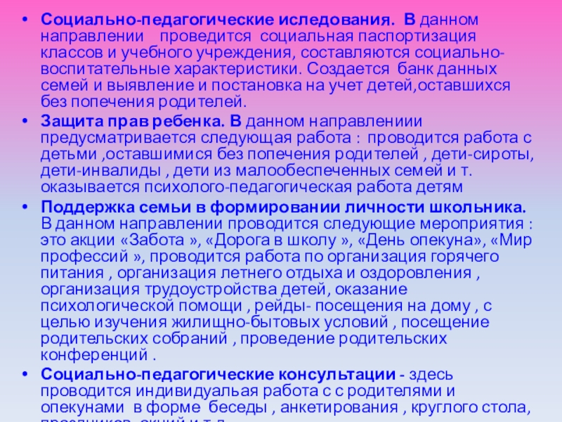 Поддержка семьи в формировании личности школьника. В данном направлении проводится следующие мероприятия : это акции «Забота », «Дорога в школу », «День опекуна», «Мир профессий », проводится работа по организация горячего питания , организация летнего отдыха и оздоровления ,организация трудоустройства детей, оказание психологической помощи , рейды- посещения на дому , с целью изучения жилищно-бытовых условий , посещение родительских собраний , проведение родительских конференций .