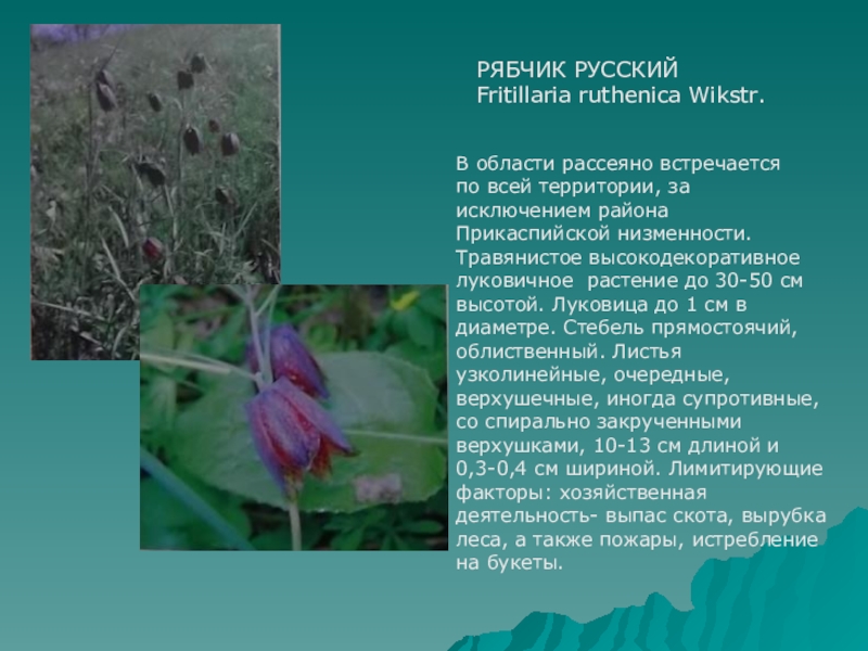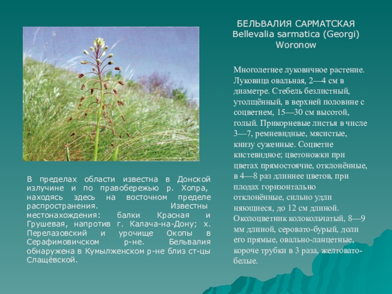 Многолетнее луковичное растение. Луковица овальная, 2—4 см в диаметре. Стебель безлистный, утолщённый, в верхней половине с соцветием, 15—30 см высотой, голый. Прикорневые листья в числе 3—7, ремневидные, мясистые, книзу суженные. Соцветие кистевидное; цветоножки при цветах прямостоячие, отклонённые, в 4—8 раз длиннее цветов, при плодах горизонтально отклонённые, сильно удлиняющиеся, до 12 см длиной. Околоцветник колокольчатый, 8—9 мм длиной, серовато-бурый, доли его прямые, овально-ланцетные, короче трубки в 3 раза, желтовато-белые.