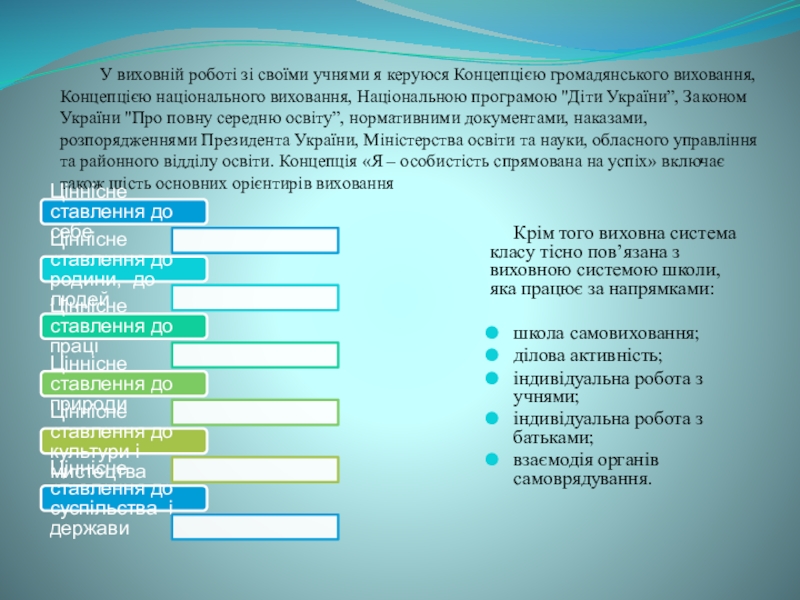 Крім того виховна система класу тісно пов’язана з виховною системою школи, яка працює за напрямками: