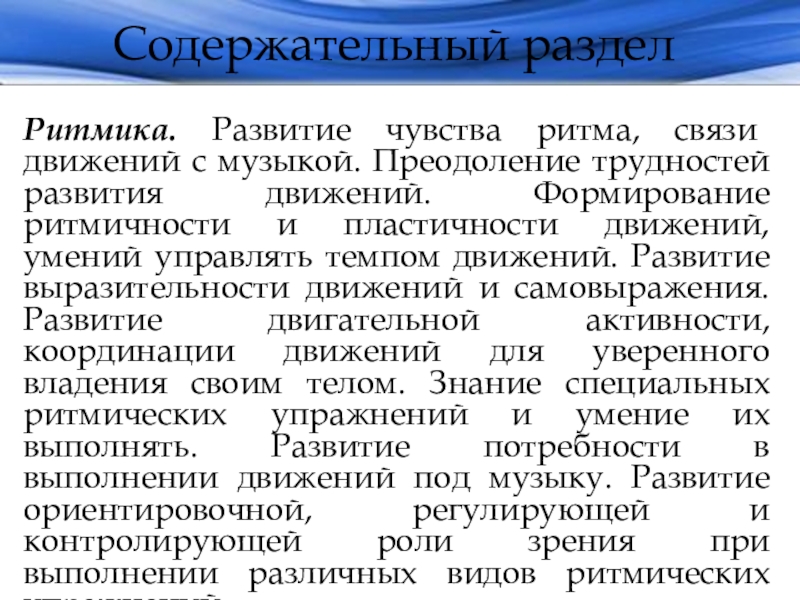 развития движений. Формирование ритмичности и пластичности движений, умений управлять темпом движений. Развитие выразительности движений и самовыражения. Развитие двигательной активности, координации движений для уверенного владения своим телом. Знание специальных ритмических упражнений и умение их выполнять. Развитие потребности в выполнении движений под музыку. Развитие ориентировочной, регулирующей и контролирующей роли зрения при выполнении различных видов ритмических упражнений.