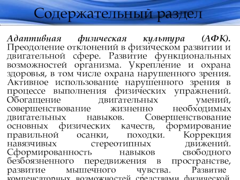 двигательной сфере. Развитие функциональных возможностей организма. Укрепление и охрана здоровья, в том числе охрана нарушенного зрения. Активное использование нарушенного зрения в процессе выполнения физических упражнений. Обогащение двигательных умений, совершенствование жизненно необходимых двигательных навыков. Совершенствование основных физических качеств, формирование правильной осанки, походки. Коррекция навязчивых стереотипных движений. Сформированность навыков свободного безбоязненного передвижения в пространстве, развитие мышечного чувства. Развитие компенсаторных возможностей средствами физической культуры.