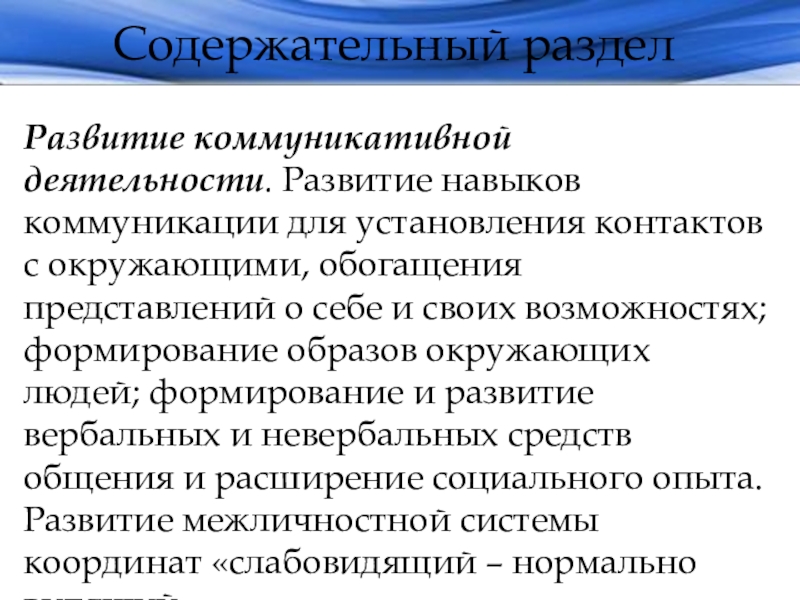 окружающими, обогащения представлений о себе и своих возможностях; формирование образов окружающих людей; формирование и развитие вербальных и невербальных средств общения и расширение социального опыта. Развитие межличностной системы координат «слабовидящий – нормально видящий».