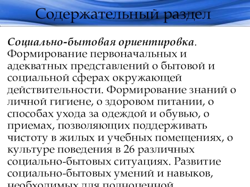 социальной сферах окружающей действительности. Формирование знаний о личной гигиене, о здоровом питании, о способах ухода за одеждой и обувью, о приемах, позволяющих поддерживать чистоту в жилых и учебных помещениях, о культуре поведения в 26 различных социально-бытовых ситуациях. Развитие социально-бытовых умений и навыков, необходимых для полноценной самостоятельной жизни.