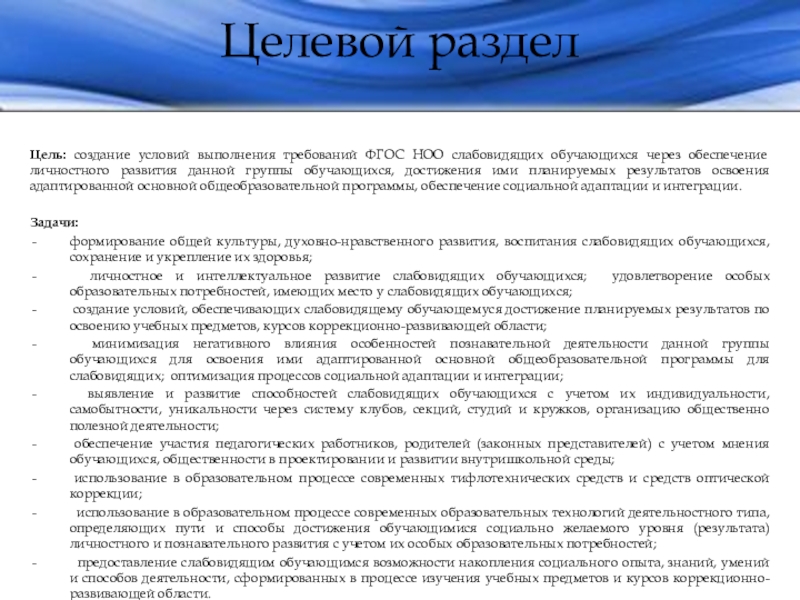 личностное и интеллектуальное развитие слабовидящих обучающихся; удовлетворение особых образовательных потребностей, имеющих место у слабовидящих обучающихся;