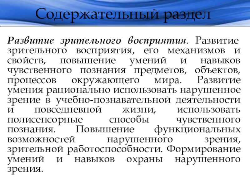 повышение умений и навыков чувственного познания предметов, объектов, процессов окружающего мира. Развитие умения рационально использовать нарушенное зрение в учебно-познавательной деятельности и повседневной жизни, использовать полисенсорные способы чувственного познания. Повышение функциональных возможностей нарушенного зрения, зрительной работоспособности. Формирование умений и навыков охраны нарушенного зрения.