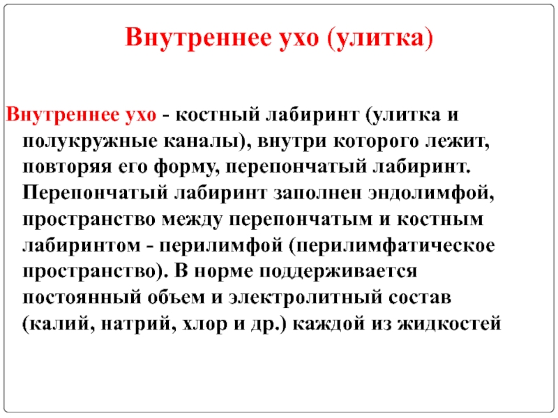 повторяя его форму, перепончатый лабиринт. Перепончатый лабиринт заполнен эндолимфой, пространство между перепончатым и костным лабиринтом - перилимфой (перилимфатическое пространство). В норме поддерживается постоянный объем и электролитный состав (калий, натрий, хлор и др.) каждой из жидкостей