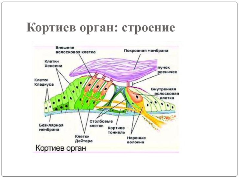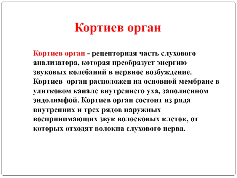 Кортиев орган - рецепторная часть слухового анализатора, которая преобразует энергию
