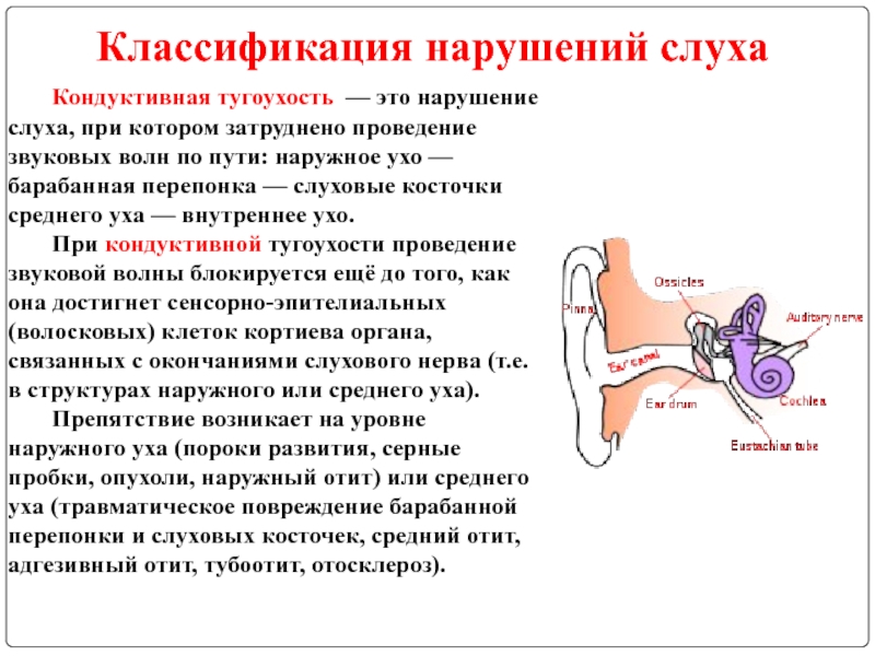 Препятствие возникает на уровне наружного уха (пороки развития, серные пробки, опухоли, наружный отит) или среднего уха (травматическое повреждение барабанной перепонки и слуховых косточек, средний отит, адгезивный отит, тубоотит, отосклероз).