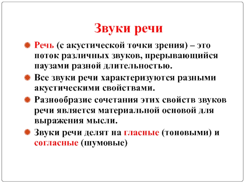 Звуки речи делят на гласные (тоновыми) и согласные (шумовые)