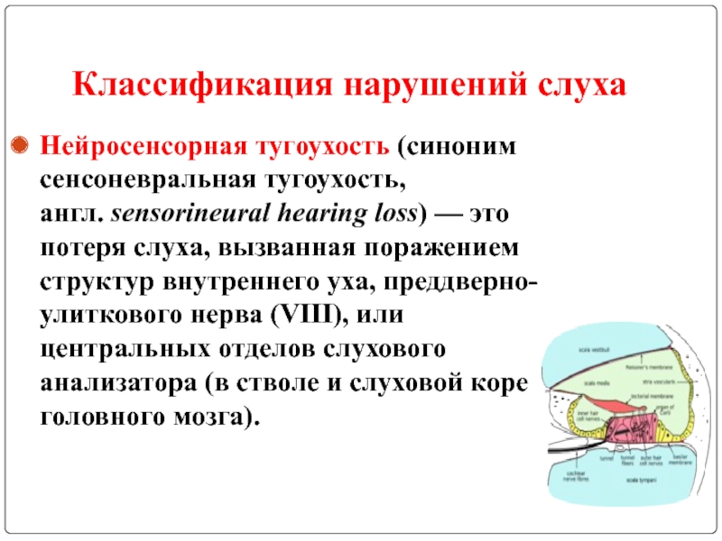это потеря слуха, вызванная поражением структур внутреннего уха, преддверно-улиткового нерва (VIII), или центральных отделов слухового анализатора (в стволе и слуховой коре головного мозга).