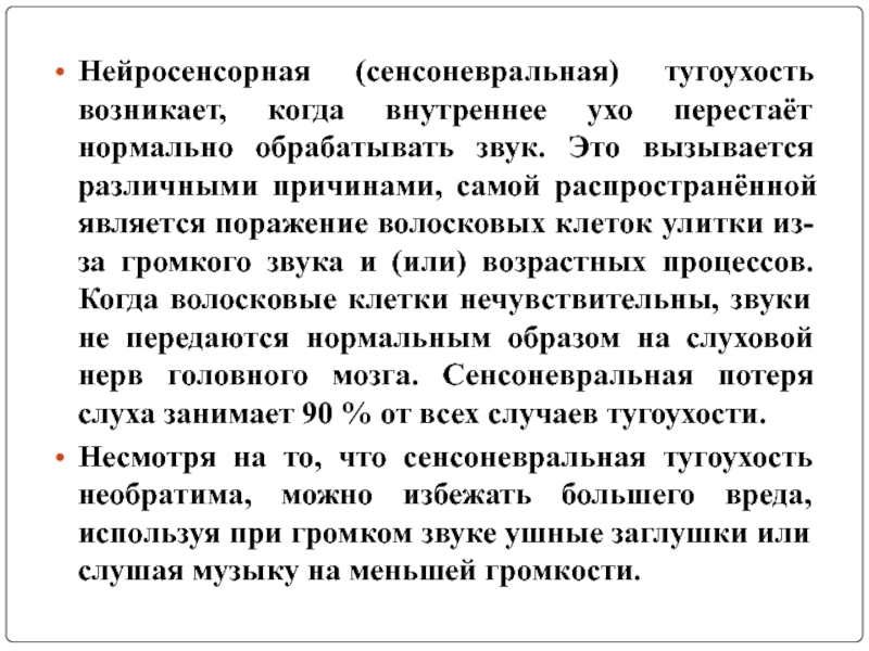 Слайд 20Нейросенсорная (сенсоневральная) тугоухость возникает, когда внутреннее ухо перестаёт нормально обрабатывать звук.