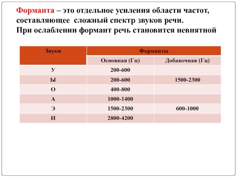 Слайд 6Форманта – это отдельное усиления области частот, составляющее сложный спектр звуков