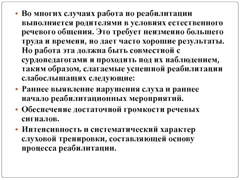 речевого общения. Это требует неизменно большего труда и времени, но дает часто хорошие результаты. Но работа эта должна быть совместной с сурдопедагогами и проходить под их наблюдением, таким образом, слагаемые успешной реабилитации слабослышащих следующие: