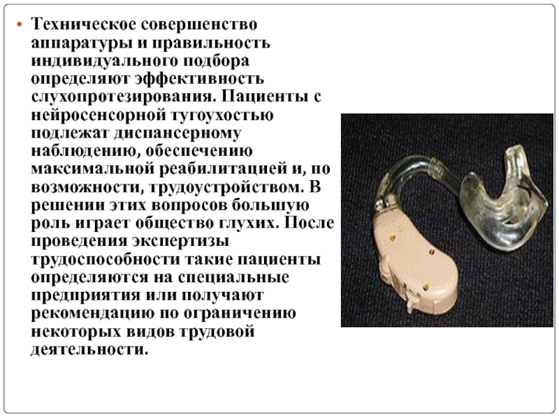 Слайд 23Техническое совершенство аппаратуры и правильность индивидуального подбора определяют эффективность слухопротезирования. Пациенты