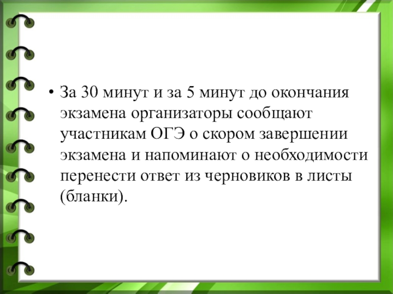 сообщают участникам ОГЭ о скором завершении экзамена и напоминают о необходимости перенести ответ из черновиков в листы (бланки).