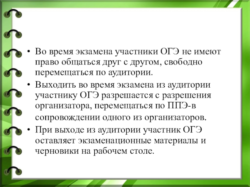 При выходе из аудитории участник ОГЭ оставляет экзаменационные материалы и черновики на рабочем столе.