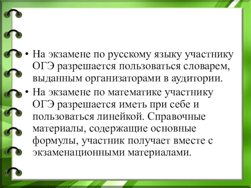 На экзамене по математике участнику ОГЭ разрешается иметь при себе и пользоваться линейкой. Справочные материалы, содержащие основные формулы, участник получает вместе с экзаменационными материалами.