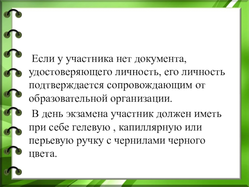 В день экзамена участник должен иметь при себе гелевую , капиллярную или перьевую ручку с чернилами черного цвета.