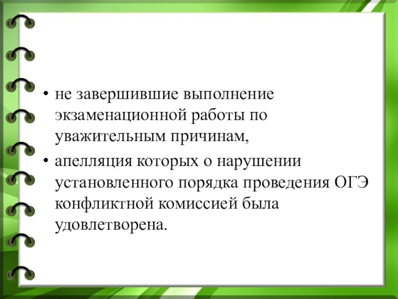 не завершившие выполнение экзаменационной работы по уважительным причинам,