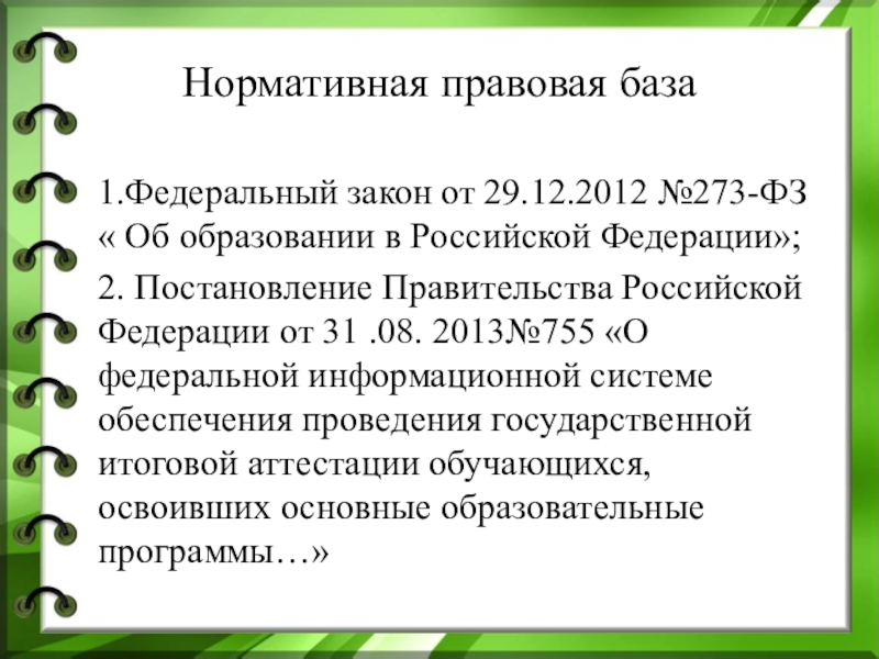 2. Постановление Правительства Российской Федерации от 31 .08. 2013№755 «О федеральной информационной системе обеспечения проведения государственной итоговой аттестации обучающихся, освоивших основные образовательные программы…»