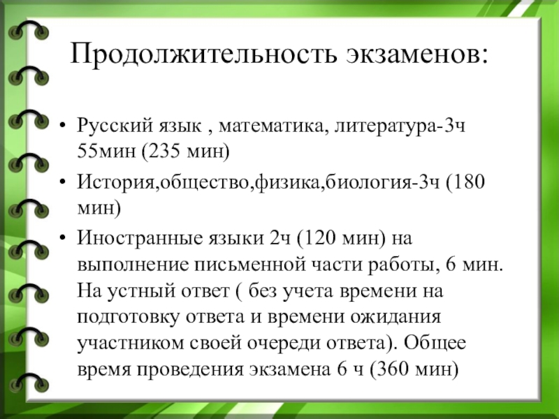 языки 2ч (120 мин) на выполнение письменной части работы, 6 мин. На устный ответ ( без учета времени на подготовку ответа и времени ожидания участником своей очереди ответа). Общее время проведения экзамена 6 ч (360 мин)