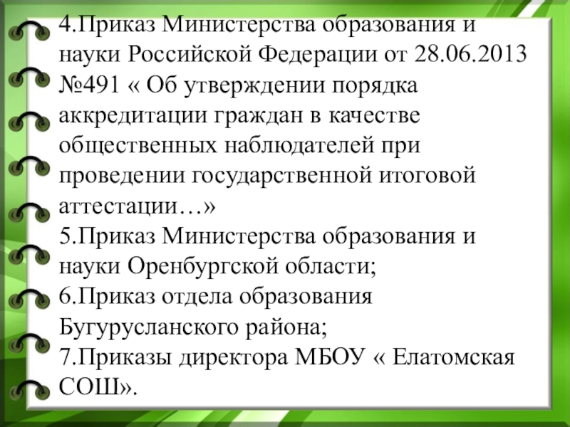4.Приказ Министерства образования и науки Российской Федерации от 28.06.2013 №491 «