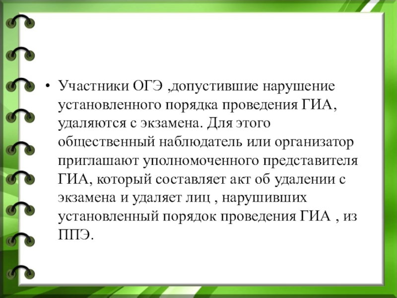 Участники ОГЭ ,допустившие нарушение установленного порядка проведения ГИА, удаляются с экзамена.