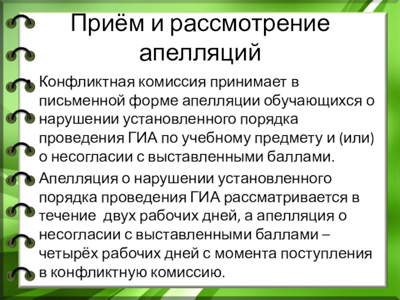 Апелляция о нарушении установленного порядка проведения ГИА рассматривается в течение двух рабочих дней, а апелляция о несогласии с выставленными баллами – четырёх рабочих дней с момента поступления в конфликтную комиссию.