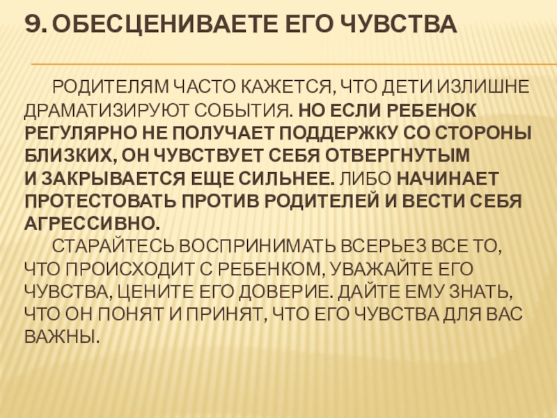 Старайтесь воспринимать всерьез все то, что происходит с ребенком, уважайте его чувства, цените его доверие. Дайте ему знать, что он понят и принят, что его чувства для вас важны.