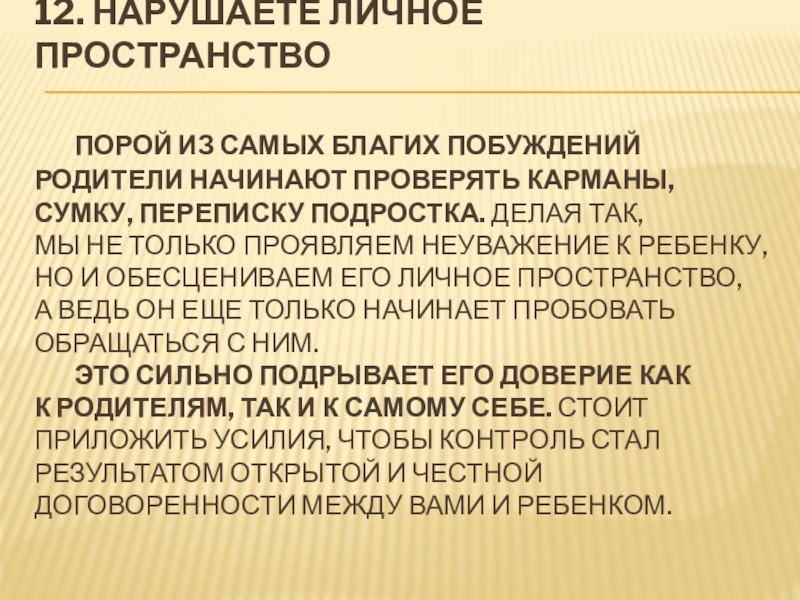 сумку, переписку подростка. Делая так, мы не только проявляем неуважение к ребенку, но и обесцениваем его личное пространство, а ведь он еще только начинает пробовать обращаться с ним.
