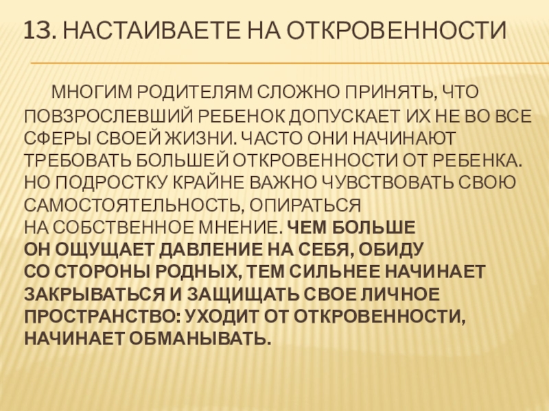 сферы своей жизни. Часто они начинают требовать большей откровенности от ребенка. Но подростку крайне важно чувствовать свою самостоятельность, опираться на собственное мнение. Чем больше он ощущает давление на себя, обиду со стороны родных, тем сильнее начинает закрываться и защищать свое личное пространство: уходит от откровенности, начинает обманывать.