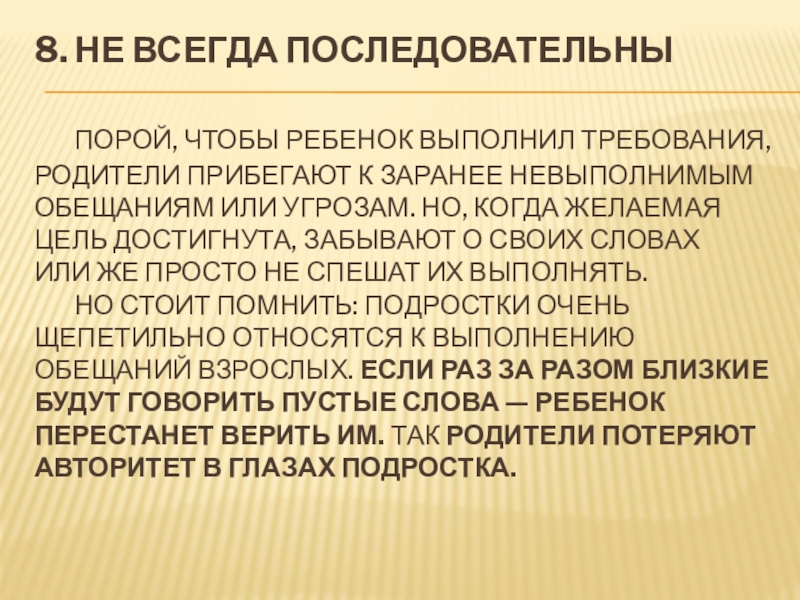 Но стоит помнить: подростки очень щепетильно относятся к выполнению обещаний взрослых. Если раз за разом близкие будут говорить пустые слова — ребенок перестанет верить им. Так родители потеряют авторитет в глазах подростка.