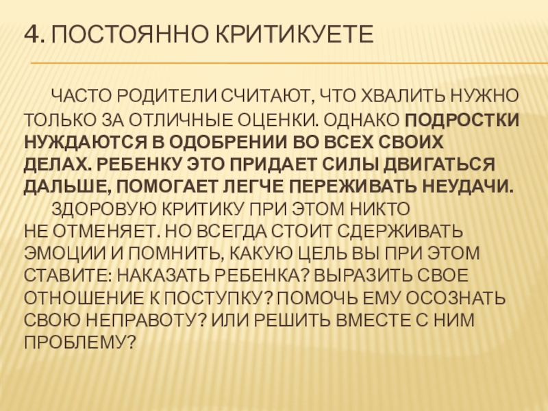 Здоровую критику при этом никто не отменяет. Но всегда стоит сдерживать эмоции и помнить, какую цель вы при этом ставите: наказать ребенка? Выразить свое отношение к поступку? Помочь ему осознать свою неправоту? Или решить вместе с ним проблему?