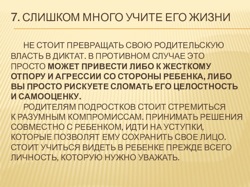 Родителям подростков стоит стремиться к разумным компромиссам. Принимать решения совместно с ребенком, идти на уступки, которые позволят ему сохранить свое лицо. Стоит учиться видеть в ребенке прежде всего личность, которую нужно уважать.