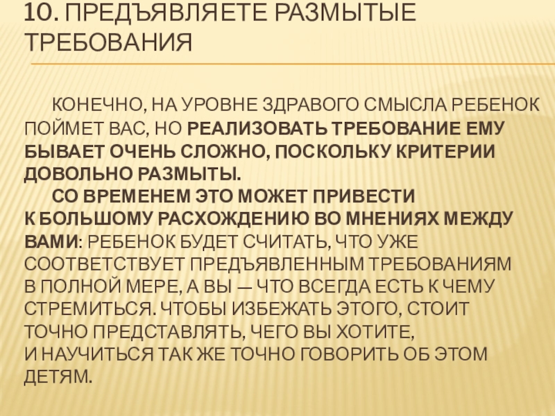 Со временем это может привести к большому расхождению во мнениях между вами: ребенок будет считать, что уже соответствует предъявленным требованиям в полной мере, а вы — что всегда есть к чему стремиться. Чтобы избежать этого, стоит точно представлять, чего вы хотите, и научиться так же точно говорить об этом детям.