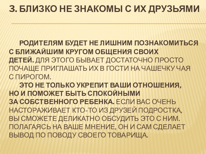 Это не только укрепит ваши отношения, но и поможет быть спокойными за собственного ребенка. Если вас очень настораживает кто-то из друзей подростка, вы сможете деликатно обсудить это с ним. Полагаясь на ваше мнение, он и сам сделает вывод по поводу своего товарища.