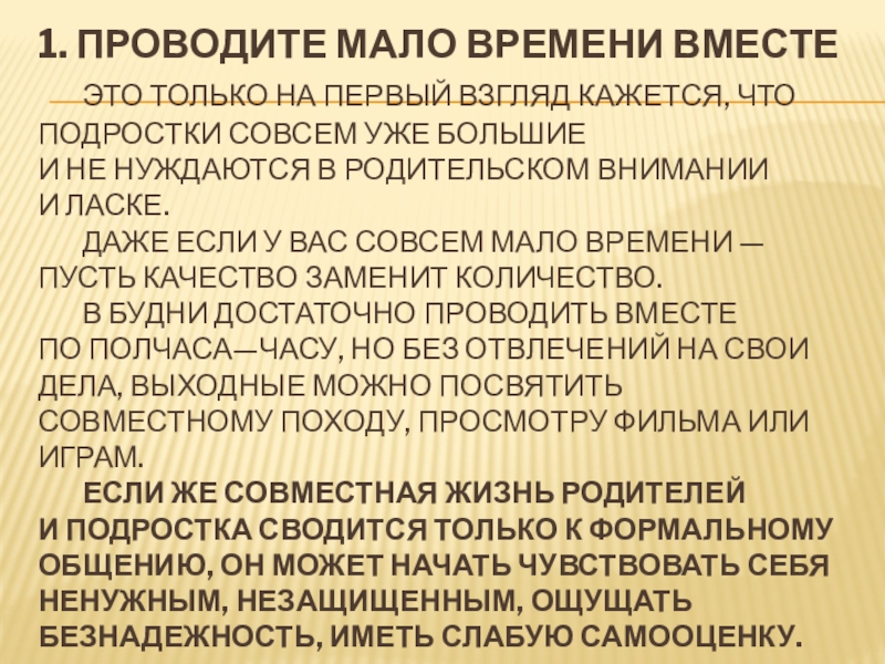 Если же совместная жизнь родителей и подростка сводится только к формальному общению, он может начать чувствовать себя ненужным, незащищенным, ощущать безнадежность, иметь слабую самооценку.