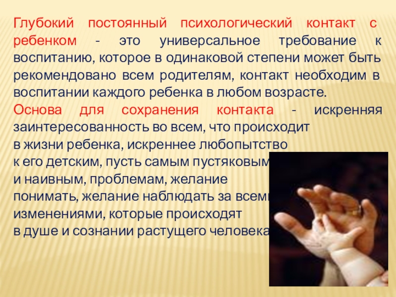 Слайд 10Глубокий постоянный психологический контакт с ребенком - это универсальное требование к