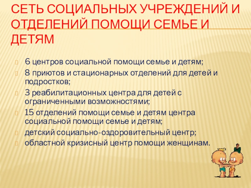 15 отделений помощи семье и детям центра социальной помощи семье и детям;